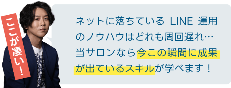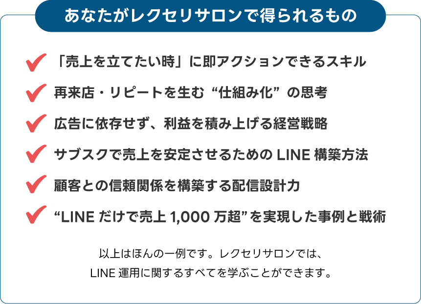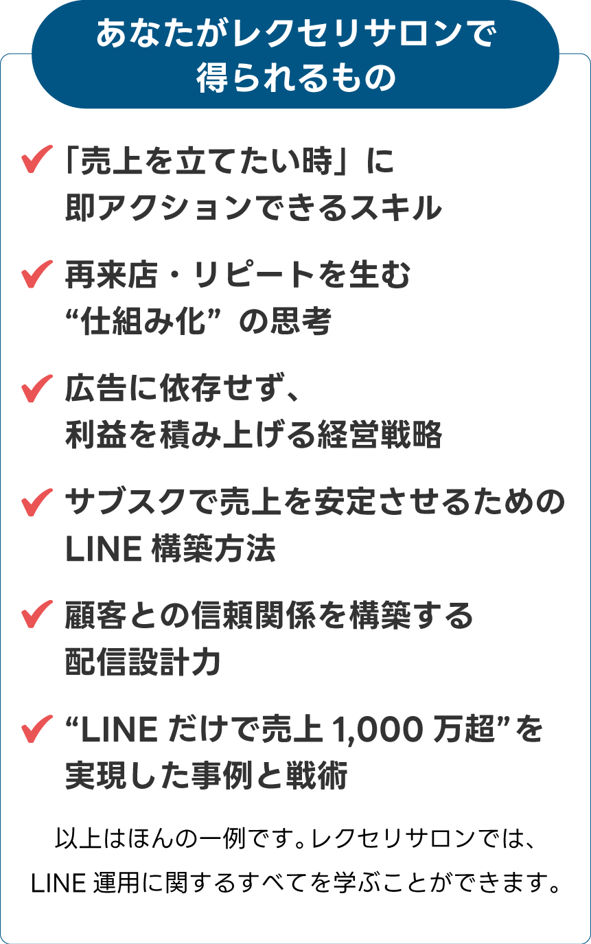 いまやLINEは単なる連絡ツールではなく、“売上を作るための武器”です。その武器の使い方をレクセリサロンで身につけてください。