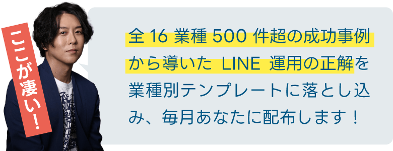 業種別・目的別に設計された高品質なLINE配信テンプレートを毎月配布。反応率の高い構成が最初から組み込まれており、誰でもすぐに配信に取り入れることができます。忙しい方でも、成果が出る型をそのまま使えるのが魅力です。
